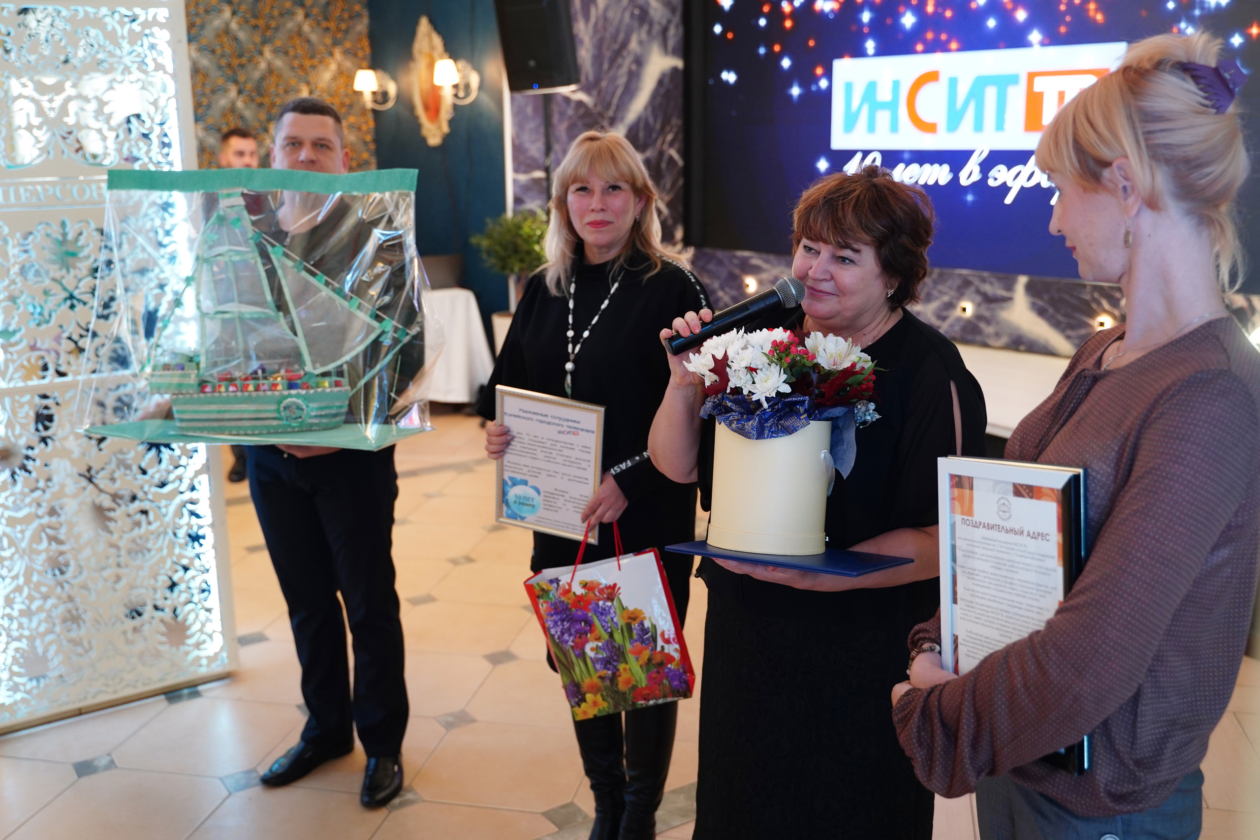 10 лет в эфире! Телеканал «Инсит-ТВ» отметил большой юбилей. Свою «десятку» все те, кто причастен к общему делу встретили в праздничной камерной обстановке. Программу вечера украсили выступления артистов и присутствие мимов. А руководителям телеканала вручили Международный Сертификат, подтверждающий факт присвоения звезде в созвездии Лев имени "Инсит-ТВ"!